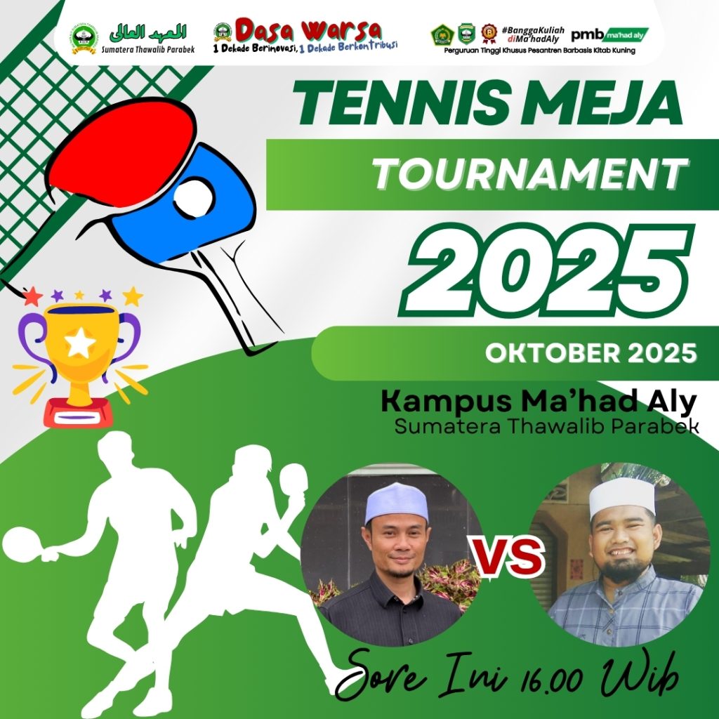 Ma’had Aly Sumatera Thawalib Parabek saat ini tengah menggelar turnamen tenis meja yang diikuti oleh seluruh civitas akademika, mulai dari mahasantri, dosen, hingga staf. Acara yang berlangsung meriah ini menjadi ajang positif untuk mempererat tali silaturahmi sekaligus mempromosikan gaya hidup sehat di lingkungan Ma’had Aly.