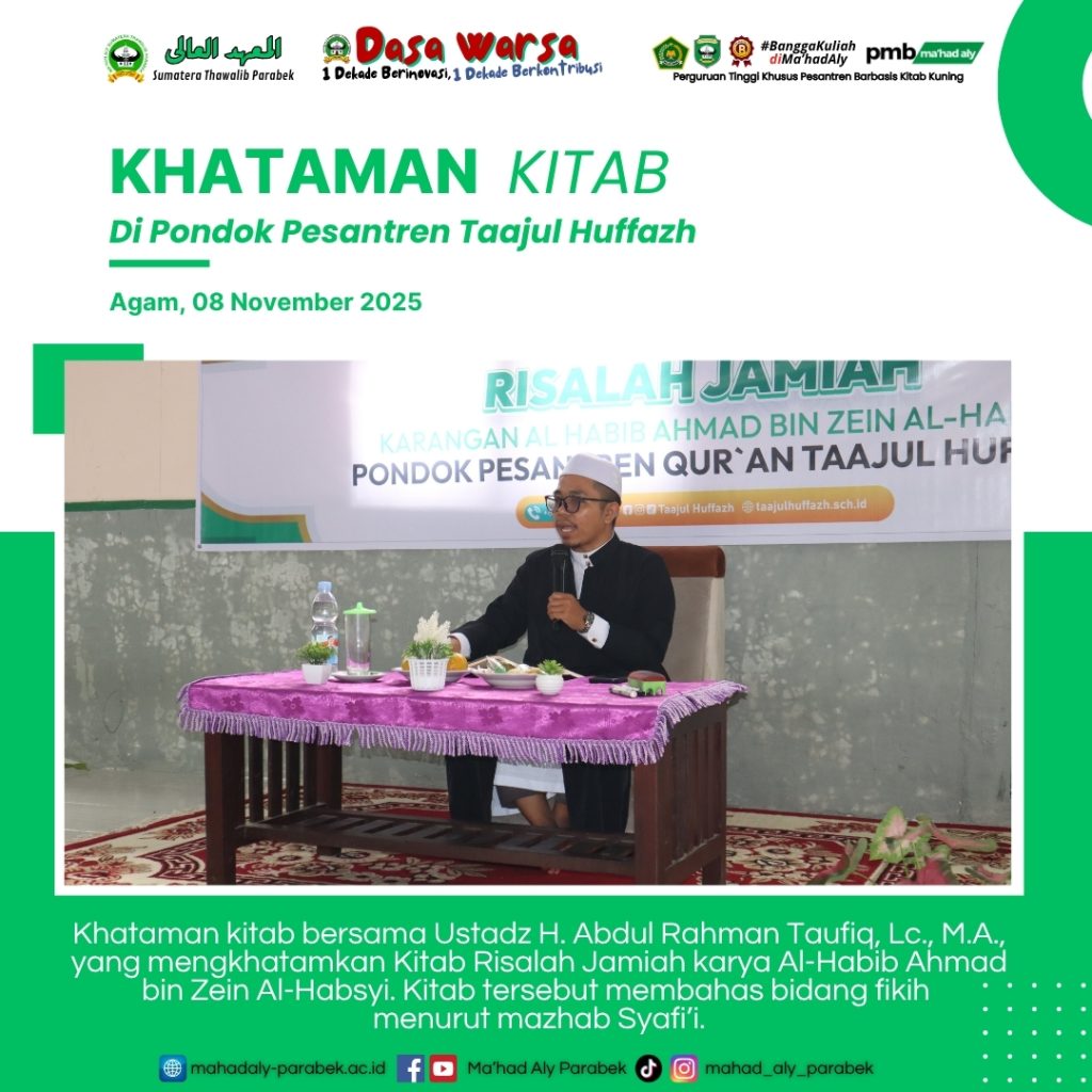Kamang Mudiak, Agam — Ma’had Aly Sumatera Thawalib Parabek kembali menggelar kegiatan ilmiah dalam rangka penguatan kajian turats dengan melaksanakan Khataman Kitab Risalah Jamiah karya Al-Habib Ahmad bin Zein Al-Habsyi Sabtu, 08 November 2025. Kegiatan tersebut menghadirkan pemateri utama, Ustadz H. Abdul Rahman Taufiq, Lc., M.A., salah seorang akademisi dan pengajar yang memiliki kompetensi mendalam di bidang ushul fikih.