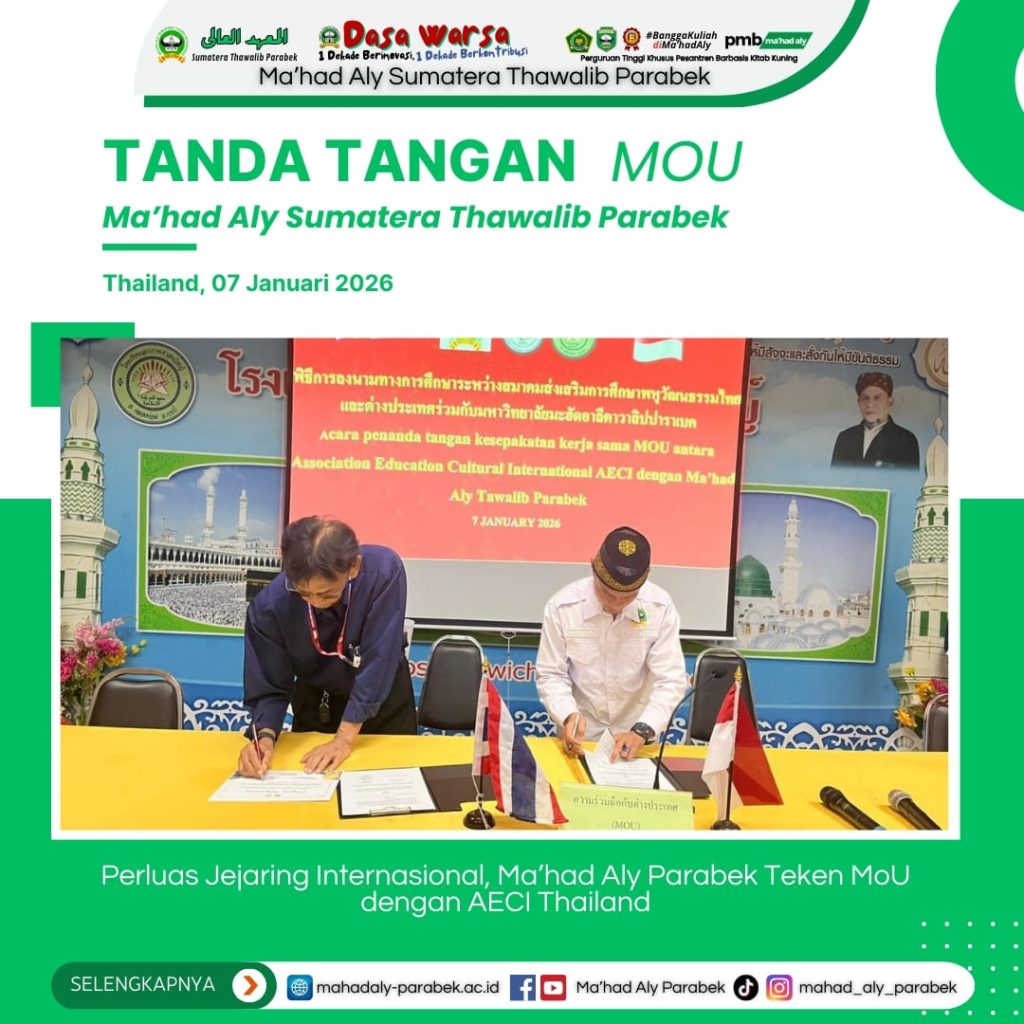 Acara yang berlangsung khidmat ini dihadiri langsung oleh Mudir Ma’had Aly Sumatera Thawalib Parabek, Ustaz Taufik Hidayat, S.Th.I., M.Pd., dan Presiden AECI Thailand Mr. Takem Kundee. Kerjasama ini bertujuan untuk meningkatkan kualitas pendidikan, pertukaran kebudayaan, serta pengembangan dakwah Islam di kawasan Asia Tenggara.